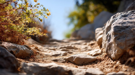 A beautiful rocky pathway streams sunlight and invites exploration, showcasing earthy textures and vibrant greenery in a serene outdoor setting.