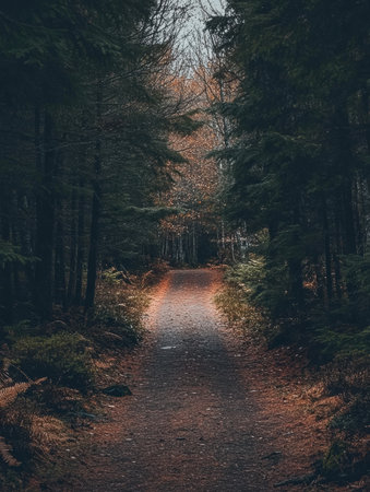 A winding pathway invites exploration into a dense forest, surrounded by tall trees and fallen leaves on the ground.