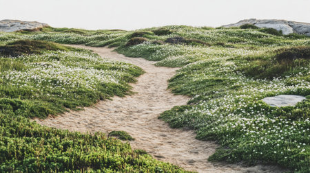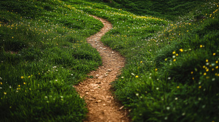 A peaceful and serene winding dirt path meanders through a lush green meadow filled with vibrant wildflowers, capturing the essence of nature in spring.