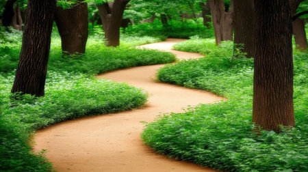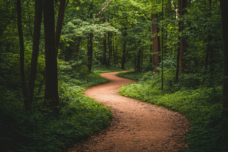Peaceful dirt trail curves through dense trees and vibrant greenery in a tranquil woodland setting