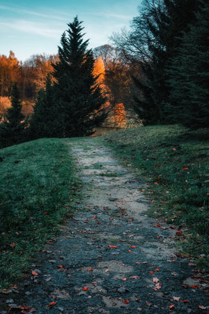Trees around a small road,path and dry leaves on ground.Natural background.View of Autumn forest