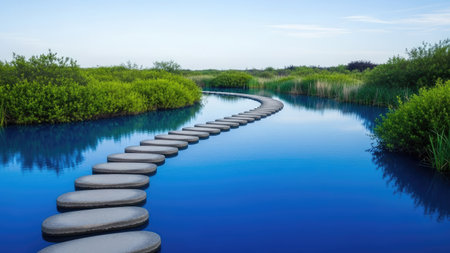 A stone pathway guides the viewer's eye across vibrant blue water, surrounded by lush green foliage. The scene is bathed in natural light under a clear sky. The image can be used in various commercial applications, including editorial and design projects.