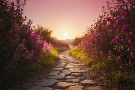 Beautiful sunset in the meadow with a stone path leading to the horizon