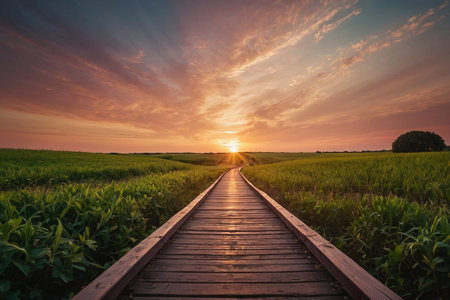 Wooden plank walkway leading to beautiful sunset in the field.