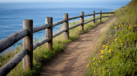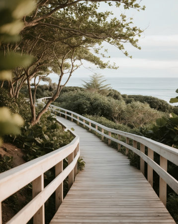 AI Generated. Exploring a Scenic Wooden Walkway to the Ocean Coastal Paradise Nature Tranquil Landscape Serene Views
