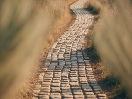 Ancient stone road stretches into the distance, showcasing a textured surface surrounded by nature, ideal for discussions on business strategies.