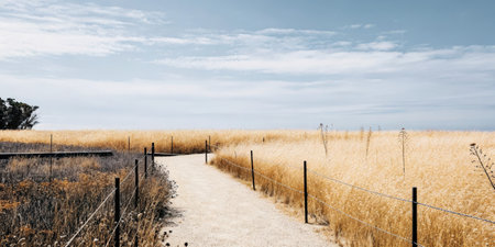 path surrounded by golden wheatgrass plant outdoor in sunny meadow shot at shallow depth of field
