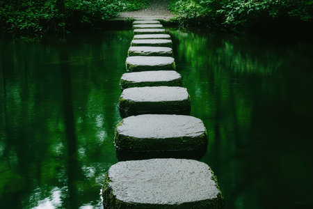 A serene pathway of stones leading through a tranquil forest, reflected in calm waters, creating a peaceful retreat in nature.
