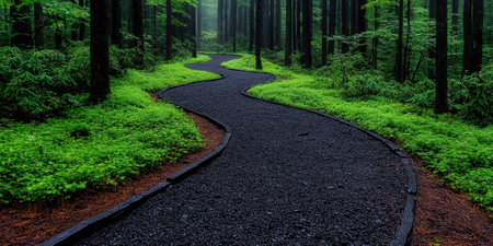 This image showcases a winding pathway through a lush green forest, surrounded by tall trees and a soft mist, creating a tranquil and inviting atmosphere for exploration.