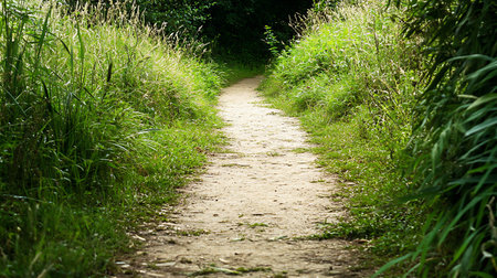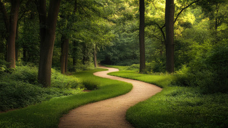 A beautiful winding path meanders through a lush green forest, inviting exploration and adventure. The serene landscape offers a peaceful escape into nature.