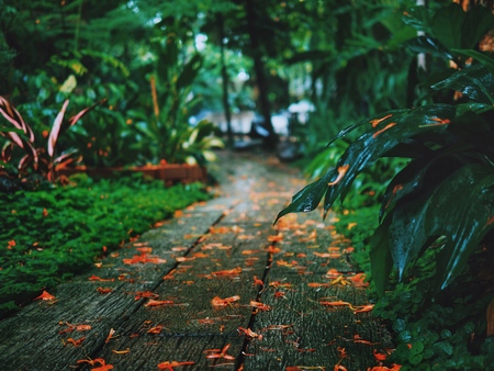 The wooden plank road of the quiet forest, the green road to the secret realm