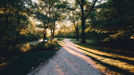 Morning light casting long shadows on gravel trail with lush trees around