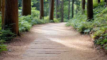 Discover a beautiful wooden pathway meandering through a vibrant green forest, inviting nature enthusiasts to explore the calm and serene wilderness all around.