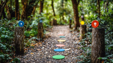 A whimsical forest path lined with colorful markers invites adventure and exploration, surrounded by lush greenery and tranquil woodland scenery. Perfect for outdoor activities.