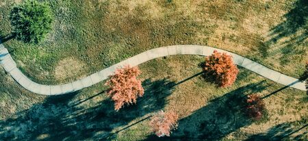 Panoramic top view curved pathway with colorful autumn leaves near Dallas, Texas