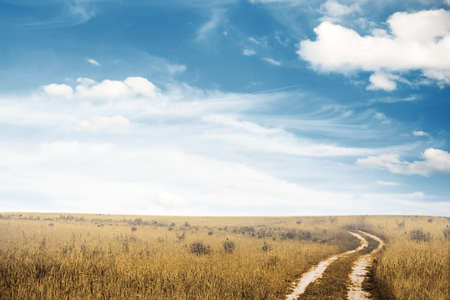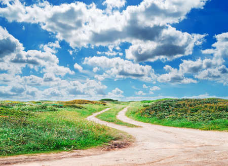 summer rural landscape. the field sandy road along bushes to the wood under the blue cloudy sky