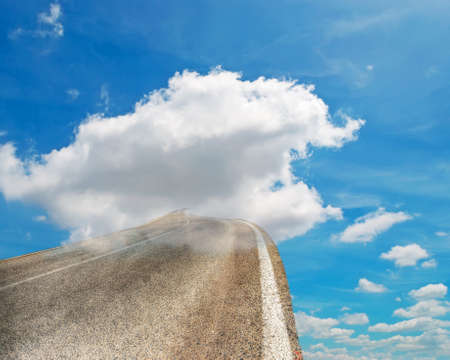Empty road through a field with dandelions. Bright sky with clouds over the road.