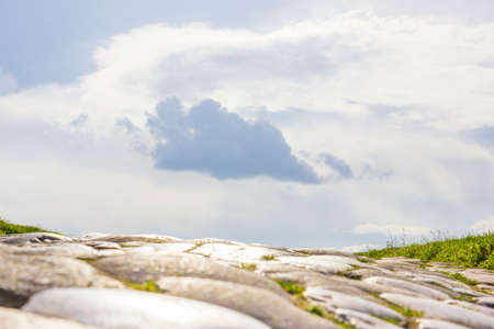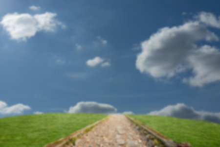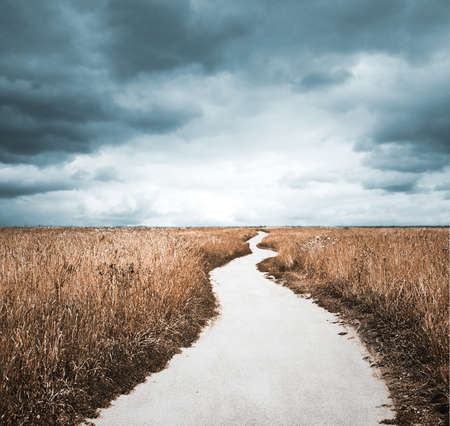 Empty pebble road to nowhere disappearing on the horizon with blue sky and dramatic clouds