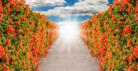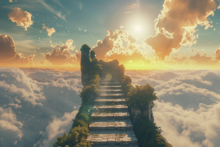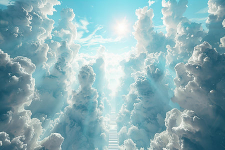 Stairway ascending toward a bright heavenly sky illuminated by radiant light above