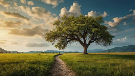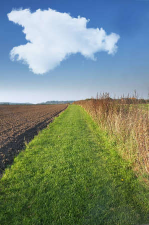 Rolling countryside with a dirt road and a blue cloudy sky in summer. 3D render.
