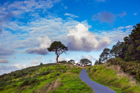 Picturesque trees grow along the sides of the path. New Zealand. Coromandel Peninsula on the North Island. The road to Cathedral Cove. The concept of active, exotic, ecological and photo tourism