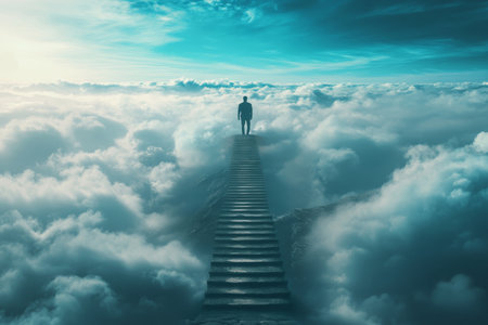 Surreal landscape a man standing above clouds surrounded by dreamlike staircases
