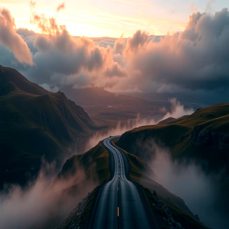 Foot path leading through mountain ridge above clouds level, AI generated image