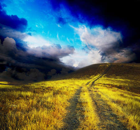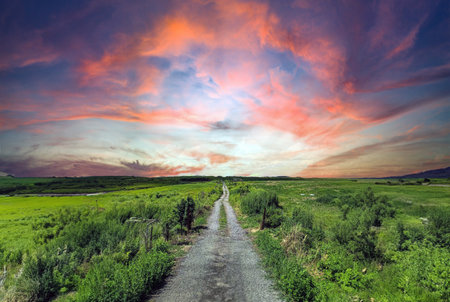 Dirt road among dark fields at sunset with dramatic cloudscape.