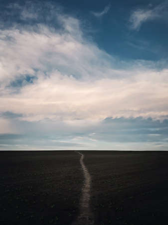 Narrow footpath across a desolate agricultural land, with growing sunflower plants, below a blue sky. Tranquil and minimalist vertical orientation background. Countryside conceptual landscape
