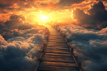Wooden bridge in the clouds at sunset time. Beautiful nature background
