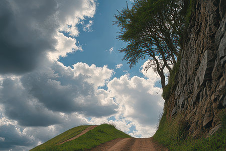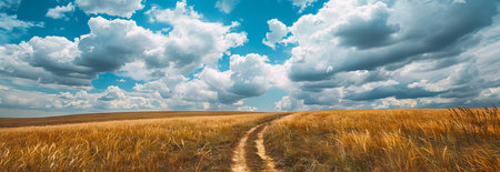Scenic Steppe Landscape with Winding Dirt Path Under Dramatic Cloudy Sky. Concept of Natural Beauty, Tranquility, Open Spaces, and Outdoor Adventure. Banner.