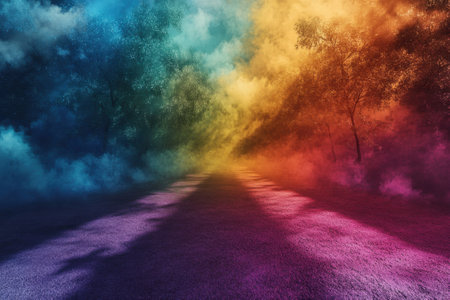 A vibrant pathway is obscured by colorful fog while trees stand silently in the background at dusk.