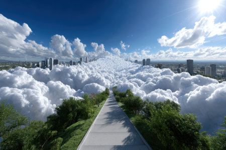 A winding pathway leads toward a stunning view of towering fluffy clouds over a vibrant skyline under bright sunlight.