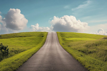 A smooth road leads through vibrant green hills, showcasing a beautiful day with fluffy clouds overhead.