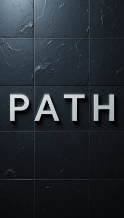 A modern interpretation of signage featuring large letters spelling PATH on a dark, textured wall. Ideal for themes of guidance, navigation, and modern design.