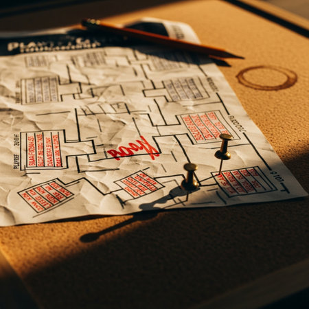 A medium shot shows a hand placing a small, red flag icon on a miniature, intricately detailed process flow chart laid out on a wooden desk