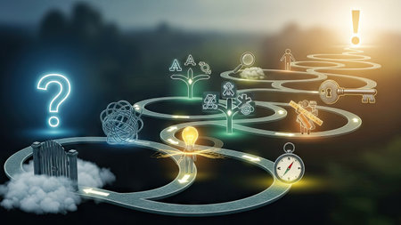 An illustrated concept shows a path with question marks, gear, and other elements. The visual incorporates a soft, blurred background with glowing lines. The composition suggests an aspirational journey. Suitable for use in a variety of business, educational, or creative projects, and presentations.