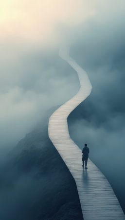 A solitary figure walks along a winding wooden path that disappears into a thick, ethereal fog. This captivating scene evokes a sense of adventure and introspection, inviting viewers to ponder the journey ahead and the mysteries that lie beyond the mist.