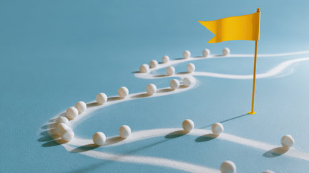 Pathway of Success with White Balls and Yellow Flag Symbolizing Goals and Achievement in a Creative Business Concept