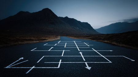 An enchanting twilight scene featuring a winding road marked with chalk arrows, symbolizing choices and directions in a tranquil natural landscape.