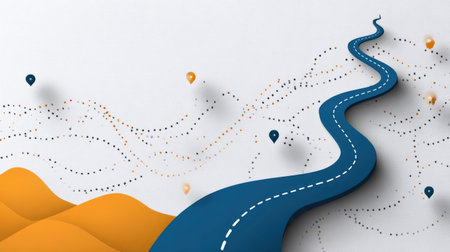 This vibrant graphic features a winding road in blue set against an orange landscape, dotted with location markers, perfect for travel and navigation themes.