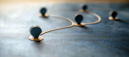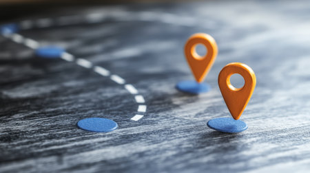 A visually striking aerial view of a conceptual road map featuring orange location pins that illustrate journey paths on a textured surface, perfect for travel and navigation themes.