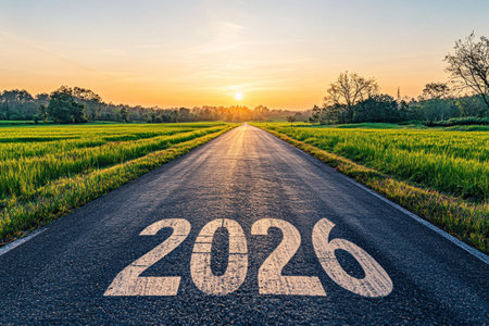 A road leading into the distance with 2026 written on it, symbolizing new beginnings and future possibilities, set against an open field at sunset, with trees lining both sides of the street. The numbers stand out clearly in the foreground. --ar 3:2 --v 6.1 Job ID: 125e1dc3-1b86-4b73-a243-4a8e3210fd47