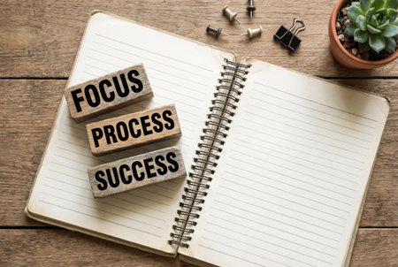 Focus on success text on wooden blocks with notebook and cactus on wooden background