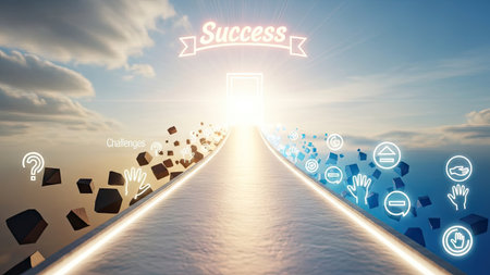 This conceptual illustration depicts a luminous pathway leading towards a bright light under a banner reading Success. The scene features a vivid sky with clouds and a path framed by abstract elements. It suggests concepts of progress, aspiration, and the pursuit of goals, potentially suitable for business and motivational publications.