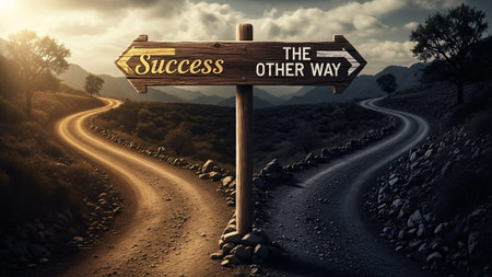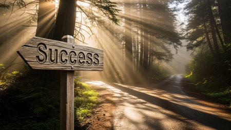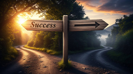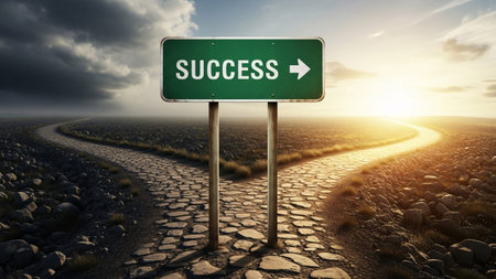 An illustrative image depicts a path leading toward a gateway labeled Big Success. The scene features a winding road with stepping stones. The vibrant green landscape and bright sunlight create a hopeful ambiance. This visual may be suitable for presentations, educational materials, or editorial content.
