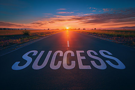 A compelling image evoking motivation, perfect for self-help books, corporate workshops, educational seminars, or advertising campaigns that focus on achievement and goal-setting | This picture presents an inspiring view of a road stretching into the horizon, with the word SUCCESS painted in bold white letters across the asphalt, symbolizing the journey to achieving one's aspirations. The warm hues of the sunset bathe the sky in a palette of oranges, pinks, and blues, creating a dynamic backdrop that suggests endless possibilities. The road is flanked by fields suggesting growth and progress, while the central perspective invites viewers to imagine embarking on this path to success. The image's deep focus allows for every detail, from the texture of the road to the colors of the sky, to be sharply defined—an allegory for clarity of purpose and direction | Ideal for incorporation into visual aids for motivational speaking, as an empowering feature in articles about personal development, or as a vibrant and hopeful cover image for planners and journals themed around success and ambition. It also serves as an inspiring desktop or mobile wallpaper, inviting reflection on goals and progress every time one glances at their screen | a dramatic photo of a road leading towards a beautiful sunset, with SUCCESS written across the roadway, invoking aspirations and providing a metaphor for the journey towards personal and professional goals under a vibrant, dramatic sky which offers ample room for motivational text or logo placement