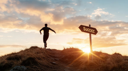 A person running up a hill toward a signpost that reads 'Success,' symbolizing the pursuit of goals