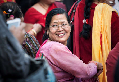 SWAYAMBHUNATH, KATHMANDU, NEPAL - APRIL 5, 2014 Happy Nepali woman in sari at religious festival near Swayambhunath stupa