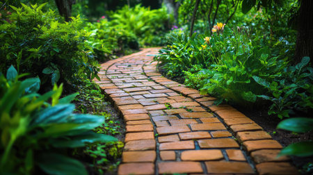 A weathered brick pathway leading through a lush garden, with greenery encroaching on the edges for a charming look